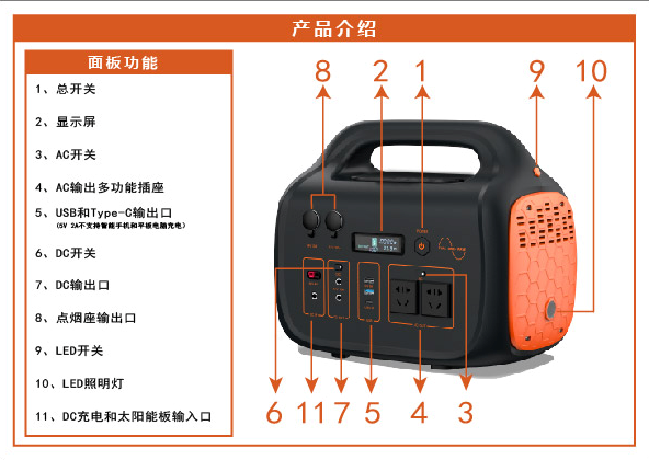 - Подржава пуњење и пражњење у исто време. Има широк спектар употребе. Може се користити као мрежно УПС напајање или као резервно напајање за ванредне ситуације на отвореном. Може да задовољи унутрашњу медицинску опрему, мале штампаче, разне лампе, мале грејаче акваријума, бележнице и камповање на отвореном. Користи се када су осветљење и напајање наизменичном струјом потребни у приликама као што су фотографисање, случај пожара, спасавање у хитним случајевима и помоћ у катастрофама.