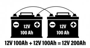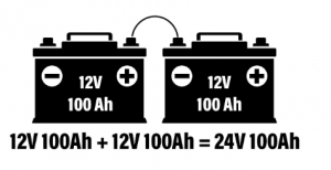 На слици испод постоје два 12В батерије спојено у серију што ову батерију претвара у 24В систем. Такође можете видети да банка још увек има укупни рејтинг капацитета 100 Ах.